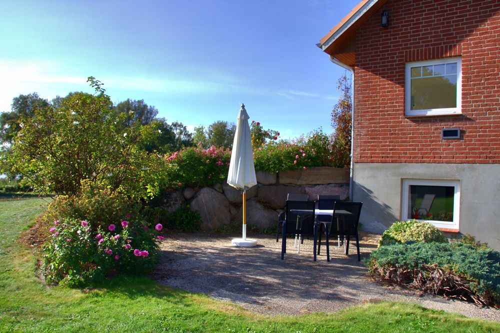 Eine großzügige, gepflasterte Terrasse liegt nach Südwesten ausgerichtet, direkt vor dem Wohnbereich, mit Blick auf Felder und See.