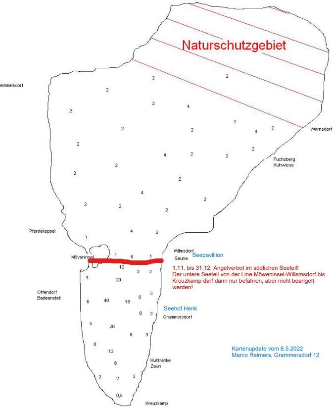 Vom 1.11. bis zum Jahresende ist das Angeln im südlichen Seeteil verboten (Siehe Seekarte oben).