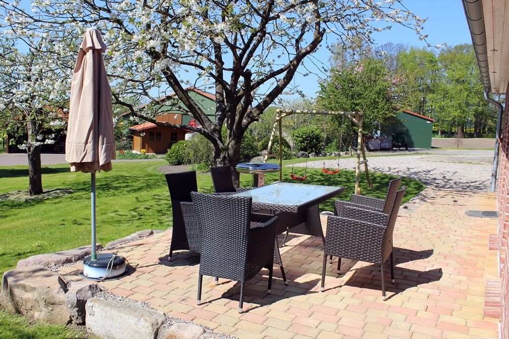 6 Stühle, ein großer Tisch und ein großer Sonnenschirm. Ein Grill steht zur Verfügung.