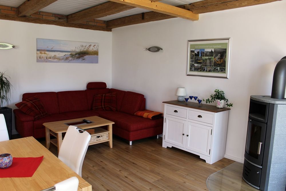 Gemütliche Couch mit Tisch und Blick auf die Terrasse. Ein Kamin rundet die Gemütlichkeit in der kalten Jahreszeit stilvoll ab. Sat TV, eine Kommode und Garderobe und Fußbodenheizung.